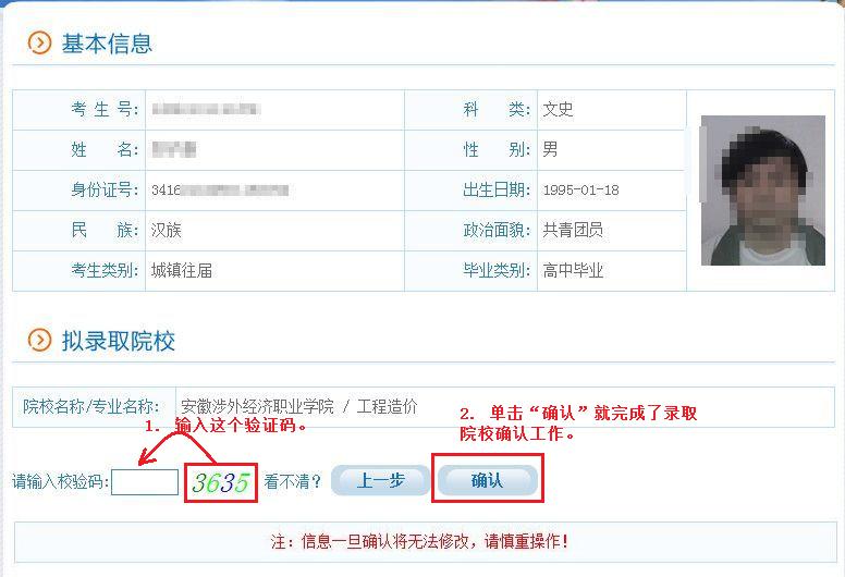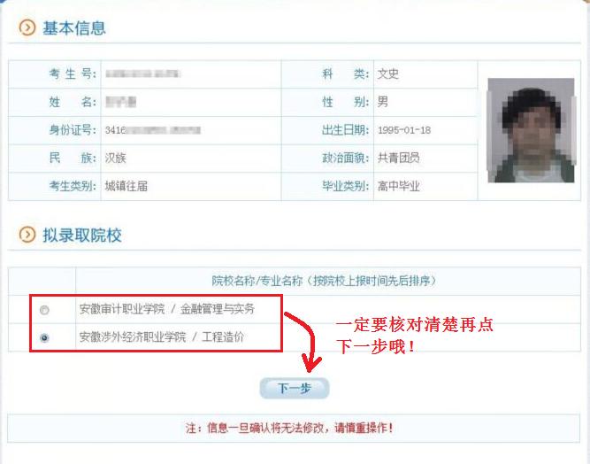 2. 用自己设定的密码重新登录,进入录取院校确认界面: