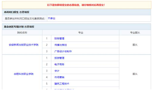表中列出了填报的所有向日葵视频官网和专业,一定要仔细核对。核对正确后: