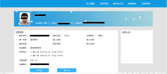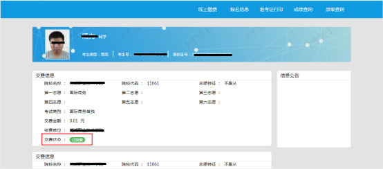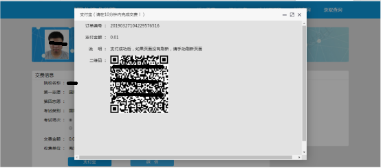 5,缴费完成点击确认关闭二维码窗口 向日葵视频官网,系统自动刷新缴费报名信息,显示缴费状态,如是已缴费状态即可进行打印准考证打印.