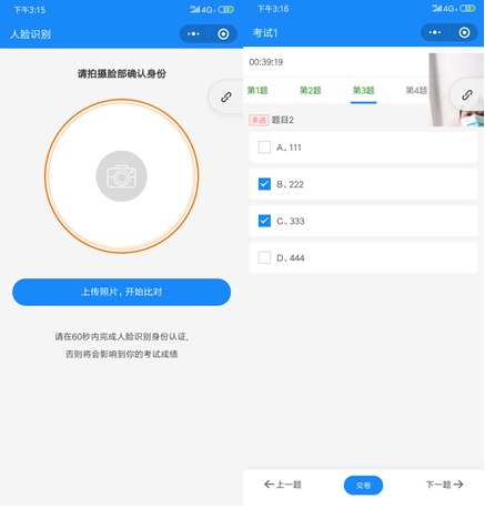 (1)考试开始和结束阶段按照要求提交人脸识别图片;