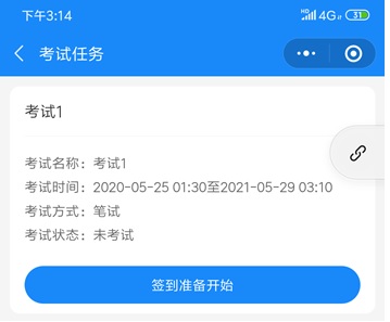 选择“考试任务”菜单,出现考试列表页面,考生只能看到自己所对应的考试项目,在考试有效时间内点击“签到,准备考试”按键进入候考页面;