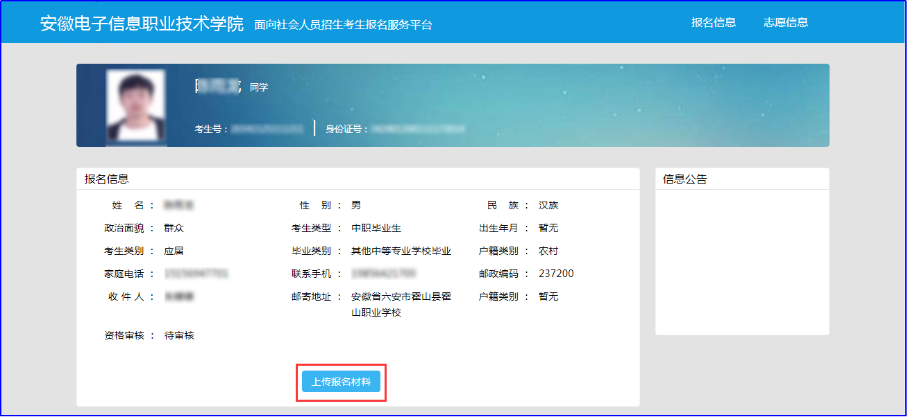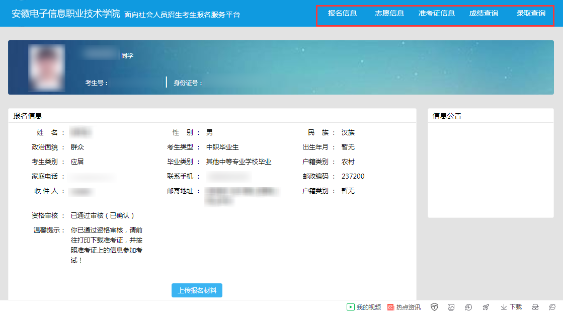 (2)登录模式:考生登录后 向日葵视频下载app,在“报名信息”栏中点击“报名材料上传”,认真阅读报名材料上传要求,并根据提示把相关材料照片上传,待后台老师审核.