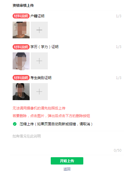 (1)免登录模式:在登录页面上点击“资格审核材料上传”,认真阅读上传须知后输入身份证号,手机号,户籍所在地,考生类别等信息,按照要求提示上传相关证明材料照片 向日葵视频官网,点击提交即可完成资料上传,待后台老师审核.