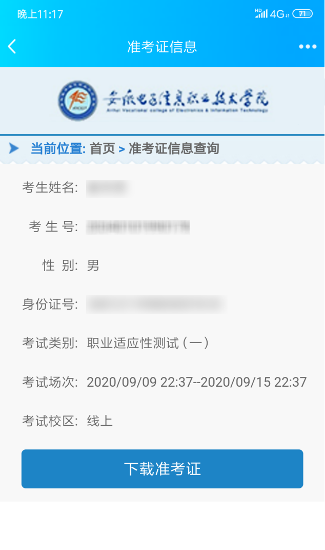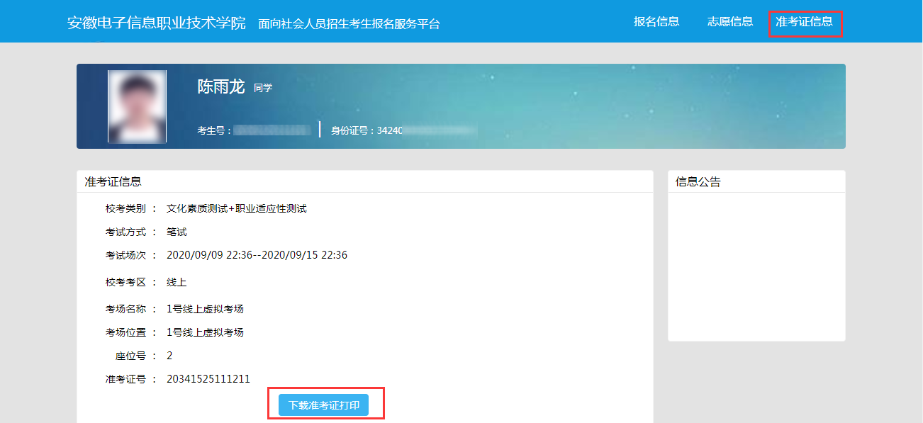 考生登录平台,可到“校考信息”栏中下载打印准考证,并根据准考证上的信息准时参加考试。