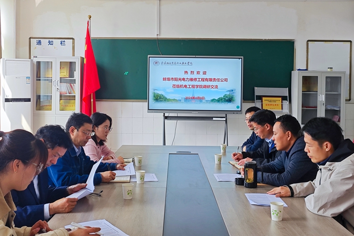 本网讯 4月9日,蚌埠市阳光电力维修工程有限责任公司党总支书记吴斌,总经理陈波一行到我院调研交流,机电工程向日葵视频下载app党总支书记,院长郝志廷,副书记赵世同,自动化教研室主任李健 向日葵视频官网,教师黄玉参加了此次交流活动。