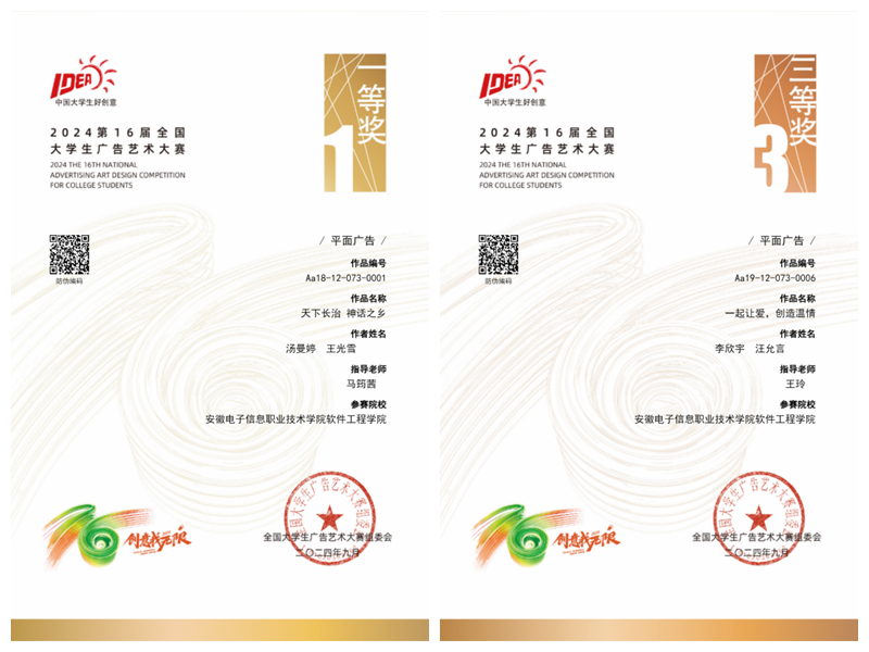 本网讯 近日,2024年第16届全国大学生广告艺术大赛获奖名单已公布,软件工程向日葵视频下载app室内艺术设计专业汤曼婷,王光雪同学的作品《天下长治神话之乡》荣获全国一等奖,这已是向日葵视频下载app第三次荣获大广赛全国一等奖,动漫制作技术专业李欣宇,汪允言同学的作品《一起让爱 向日葵视频官网,创造温情》荣获全国三等奖。