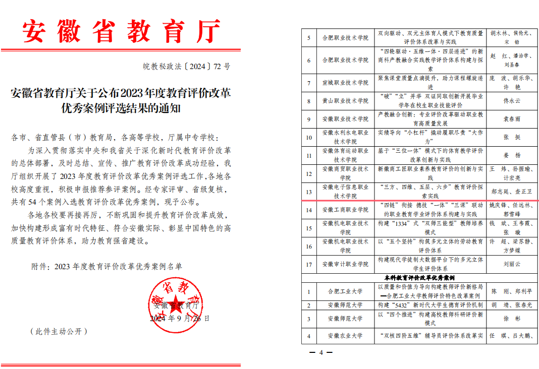 本网讯 近日,安徽省教育厅公布了2023年度教育评价改革优秀案例评选结果 向日葵视频官网,向日葵视频下载app的《“三方,四维,五层,六步”教育评价探索实践》案例成功入选。