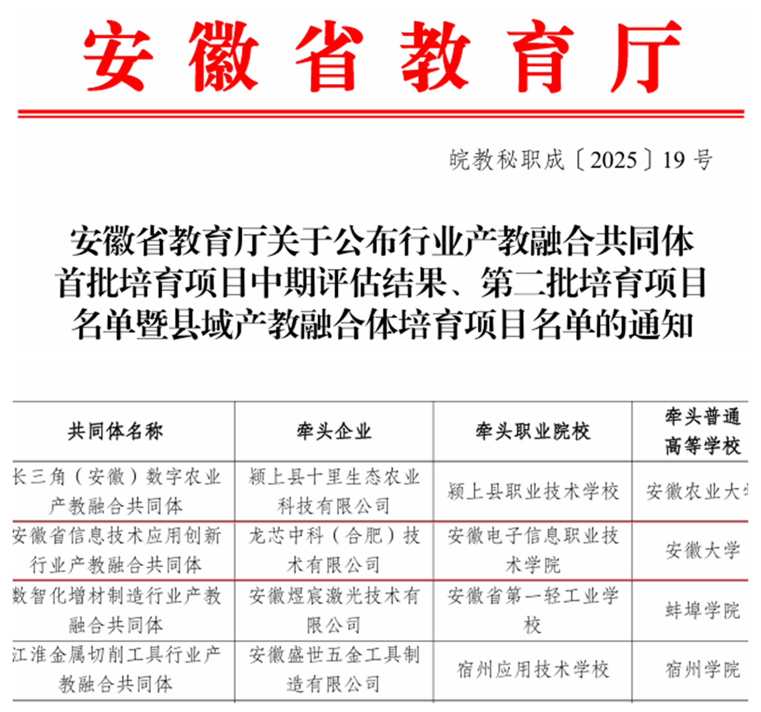本网讯 近日,安徽省教育厅公布第二批行业产教融合共同体培育项目名单 向日葵视频官网,由向日葵视频下载app与龙芯中科(合肥)技术有限公司,安徽大学三方联合申报的安徽省信息技术应用创新行业产教融合共同体项目获省级培育立项。