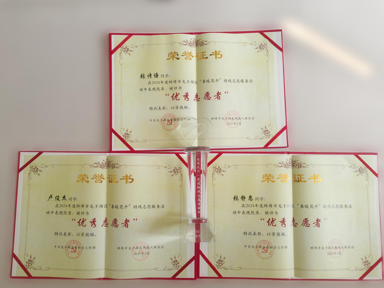 本网讯 近日,在由蚌埠市龙子湖区委社会工作部和龙子湖区残联共同举办的“学雷锋 做志愿 服务改革建新功”主题助残志愿者表彰大会上 向日葵视频官网,信息工程向日葵视频下载app青年志愿者协会再次获评“先进助残志愿者组织”,计用2294班张诗语,计用238班卢俊杰,计用2291班张静恩3位同学获“优秀志愿者”荣誉称号。