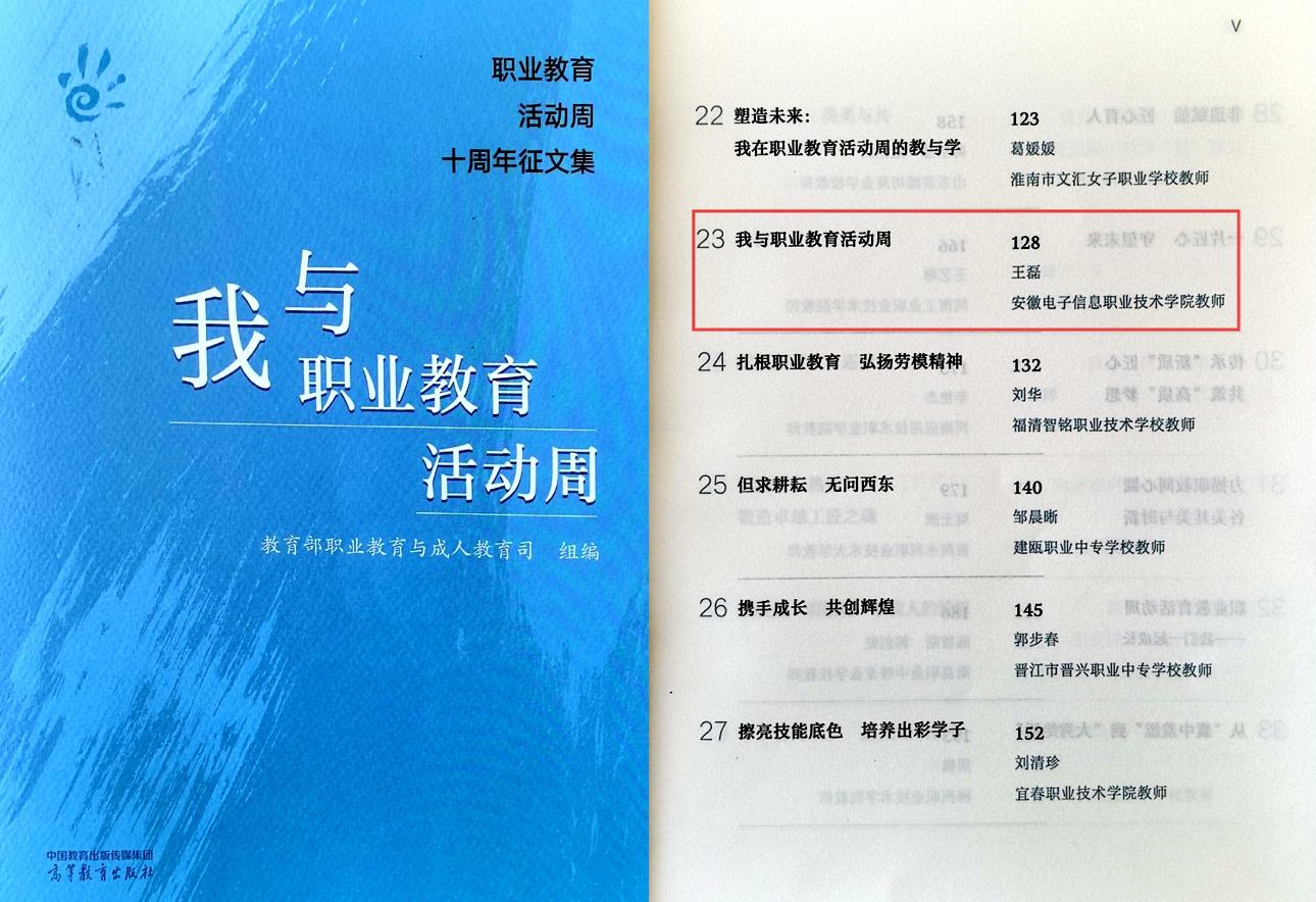 本网讯 在第十个全国职业教育活动周举办之际,由教育部职业教育与成人教育司精心编纂的《我与职业教育活动周》十周年征文集正式出版发行 向日葵视频官网,电子工程向日葵视频下载app王磊老师撰写的《我与职业教育活动周》主题征文获选入文集,是安徽省高职院校唯一入选文章。