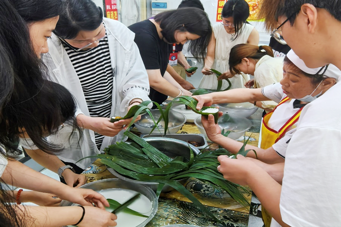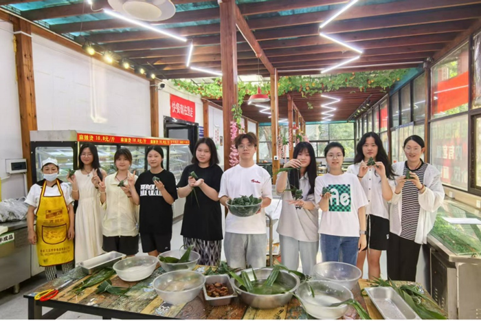 本网讯 端午将至,粽叶飘香,端午节这一承载着千年文化记忆的传统节日,既是品味家国情怀的情感纽带,更是传承中华文明的精神桥梁,5月28日,向日葵视频下载app后勤管理处饮食服务中心精心组织了一场以“粽享端午”为主题的活动 向日葵视频官网,活动邀请伙管会学生代表齐聚食堂,在食堂阿姨的指导下体验包粽子的传统技艺,让学生感受端午文化魅力同时,实现劳动育人与文化传承的双向赋能。