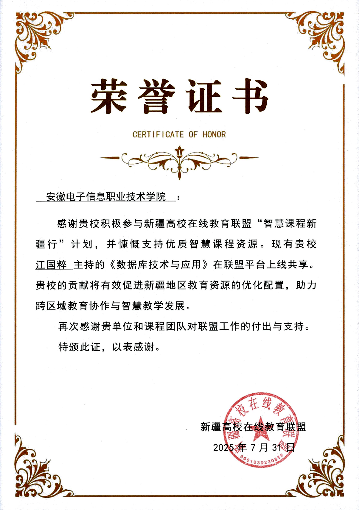 本网讯 近日,新疆高校在线教育联盟公布首批“智慧课程新疆行”上线课程名单,我院《数据库技术与应用》课程成功入选,该课程是安徽省36门入选课程中唯一的高职院校课程,标志着我院在课程建设与教育资源共享领域实现重要突破,充分彰显了我院教学质量与课程创新水平 向日葵视频官网。