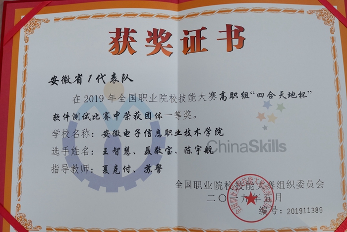 5月28日至30日,2019年全国职业院校技能大赛高职组“四合天地杯”软件测试赛在西安航空职业技术向日葵视频下载app举行,由向日葵视频下载app教师夏克付,苏警指导,学生王智慧,聂敬宝和陈宇航组成的竞赛团队,代表安徽省在高职组“四合天地杯”软件测试赛项中喜获团体一等奖 向日葵视频在线观看。