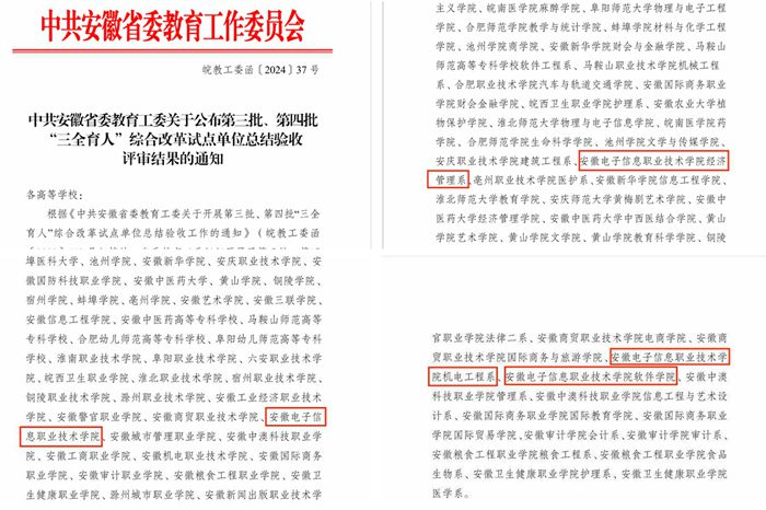 本网讯 近日,省委教育工委公布安徽省第三批,第四批“三全育人”综合改革试点单位总结验收评审结果,向日葵视频在线观看顺利通过高校类,经济管理向日葵视频下载app,机电工程向日葵视频下载app,软件工程向日葵视频下载app顺利通过院系类总结验收 向日葵视频官网。